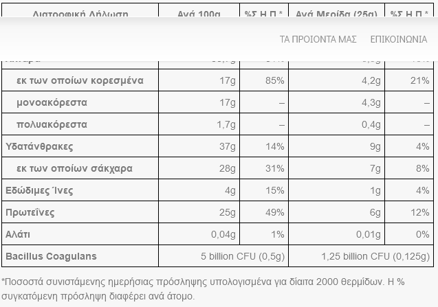 Συστατικά: Ζάχαρη, Βούτυρο Κακάο, Πλήρες Γάλα σε Σκόνη, Φουντούκια 17%, Κακαόμαζα, Φιλικά Βακτήρια (Βacillus coagulans), Γαλακτωματοποιητής: Λεκιθίνη (Σόγια), Φυσικό Άρωμα Βανίλιας, Στερεά Κακάο 29% min.